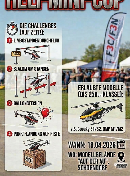 im Rahmen des diesjährigen F3C/N Experience-Days veranstalten wir dieses Jahr einen sportlichen Heli-Mini-Cup. Wir laden alle interessierten Piloten herzlich ein, ihr fliegerisches Können und ihre Präzision unter Beweis zu stellen.