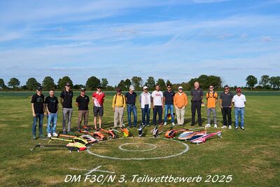 Beim 3. Teilwettbewerb der Deutschen Meisterschaften in Kleinenbroich traten am 6. und 7. September 2025 die besten Modellhubschrauberpilot:innen in den Klassen F3C und F3N gegeneinander an. Das Training am Freitag war gut besucht und ließ ausreichend Zeit für Feinjustierungen. Am Samstag startete der Wettbewerb um 8:30 Uhr mit dem Pilotenbriefing. Bei sonnigem Wetter fanden die Vorrunden im Wechselmodus statt, Sonntag ergänzte eine leichte Brise die Bedingungen.